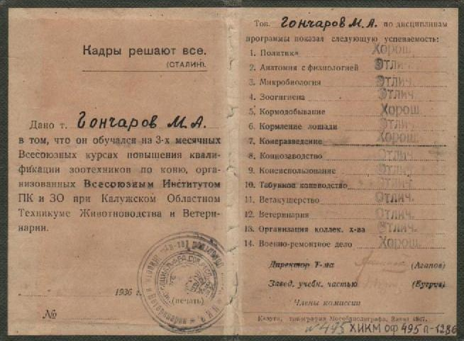 Согласно Госкаталогу, в Хабаровском историко-краеведческом музее хранится Свидетельство Гончарова М.А. об его обучении в 1936 году на 3-месячных Всесоюзных курсах повышения квалификации зоотехников по коню, организованных Всесоюзным институтом повышения квалификации и заочного образования специалистов сельского хозяйства при Калужском областном техникуме животноводства и ветеринарии.