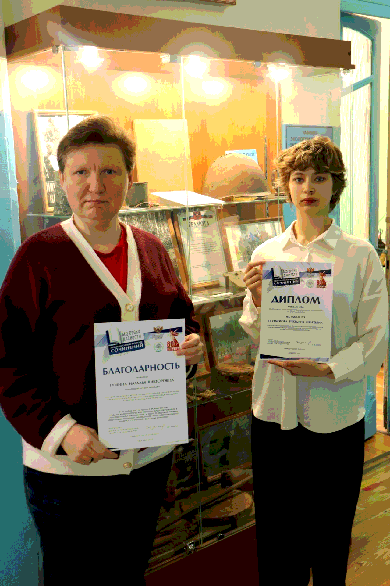 И ее наставника - заведующего музеем Наталью Викторовну Гущину. Приказом ректора Московского педагогического государственного университета А.В. Лубкова она отмечена благодарностью за вклад в формирование гражданско-патриотической позиции среди обучающихся образовательных организаций, а также за высокий уровень подготовки финалиста федерального этапа Международного конкурса сочинений "Без срока давности".