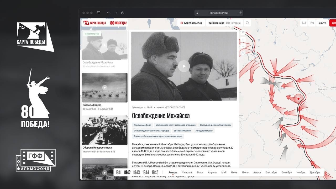 Карта Победы - это уникальная документальная хроника времен Второй мировой войны, оцифрованные кино- и фотоматериалы из коллекции Госфильмофонда России. Пользователи могут выбрать точку на карте, интересующий их отрезок военного времени и ознакомиться с ходом событий и материалами, погрузиться в исторический контекст. Видеокадры и фотоснимки размещены с указанием мест, где они были сделаны, а также синхронизированы с временной шкалой.