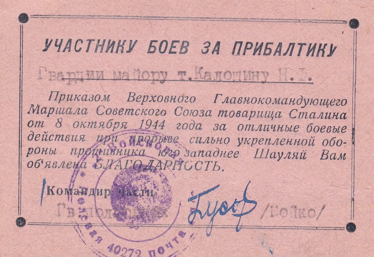 💫За отличные боевые действия при прорыве сильно укреплённой обороны противника юго-западнее Шауляя объявлена благодарность Верховного Главнокомандующего И.В. Сталина.