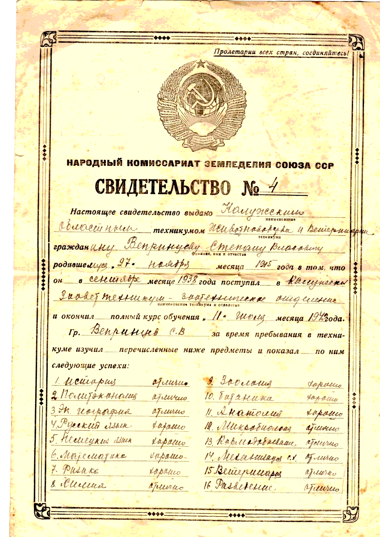 В сентябре 1938 года на зоотехническое отделение Калужского зооветехникума поступил учиться Степан Власович Вепринцев (1915 - 1994).